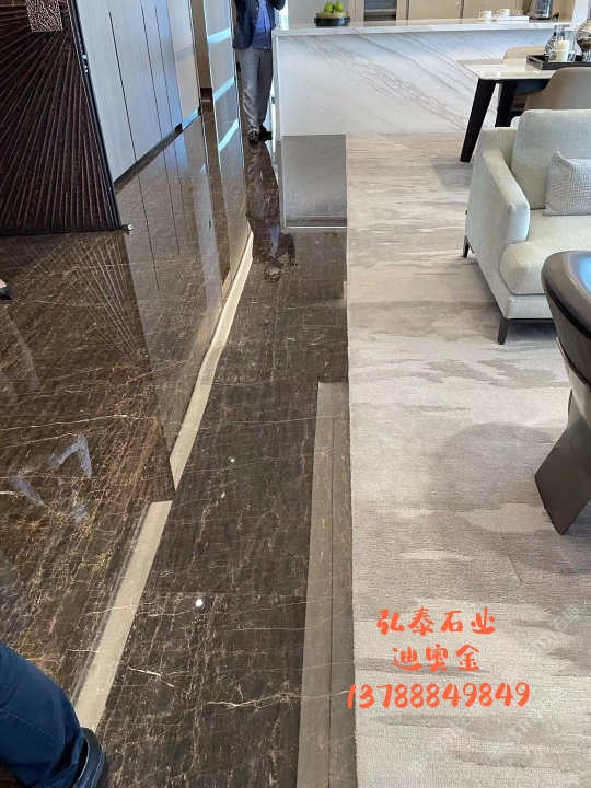 2015年,弘一集團(tuán)董事長(zhǎng)王星華在廈門(mén)展展會(huì)上與迪奧金礦主不期而遇。王星華對(duì)迪奧金表示出了極大的興趣,隨后應(yīng)邀到達(dá)礦山實(shí)地考察,在全面了解了礦山的運(yùn)營(yíng)狀況、產(chǎn)品狀況以及特性之后,王星華果斷地拿下了迪奧金及墨流金礦山的代理權(quán),并為此成立了一個(gè)單獨(dú)的石材貿(mào)易部——弘泰石業(yè),該部門(mén)由黃青海著手經(jīng)營(yíng)。 In 2015, Wang Xinghua, the chairman of Hongyi Group, met the owner of DiorGold Mine unexpectedly at the Xiamen Exhibition. Wang Xinghua expressed hisgreat interest in Dior Gold Mine, and later was invited to make on-the-spotinvestigation of the mine. After a comprehensive understanding to the operationstatus, product status and characteristics of the mine, Wang Xinghua decisivelysigned an agreement with Dior Gold Mine to get its exclusive agency, andestablished a separate stone trade department for this purpose -- Hongtai StoneIndustry, which is operated by Huang Qinghai. 弘泰石業(yè)經(jīng)營(yíng)地址位于水頭鎮(zhèn)福山工業(yè)區(qū)弘一大板市場(chǎng)一期5號(hào)通道D7-D14。弘泰石業(yè)主營(yíng)品種為迪奧金、墨流金、延河黑。其中迪奧金和墨流金年開(kāi)采量達(dá)15000m3,水頭長(zhǎng)期庫(kù)存現(xiàn)貨各20000㎡,荒料5000噸。能夠即時(shí)滿足采購(gòu)商的大量采購(gòu)需求。 Located in D7-D14, No.5 Passageway, Hongyi Slab Market Phase I, FushanIndustrial Zone, Shuitou Town, Hongtai Stone is mainly engaged in such productseries as Dior Golden, Ink Flow Golden, Yanhe Black. Among them, the annualmining yield of Dior Golden and Ink Flow Golden is up to 15,000m3, and thestock spotting of each of these two series in Shuitou warehouse is at 20000㎡, with a quantity of quarry stone at 5000 tons, which can instantly meetbulk purchasing needs of the purchasers. ?▲弘泰石業(yè)賣(mài)場(chǎng) ▲ Sales Market of Hongtai Stone 迪奧金底色偏深,表面賦以金黃色及少量白色的線狀紋路,板面表現(xiàn)力非常搶眼,材質(zhì)能適用于各種不同的異型加工方式,是的優(yōu)質(zhì)工裝材料,不同于以往的黑色系大理石帶來(lái)的沉重感,迪奧金帶來(lái)的更多的是時(shí)尚感與尊貴感。 As a rare high-quality material for industrial decoration, Dior golden hasa dark background color, with a small amount of golden yellow and white lineson its surface. The surface expressiveness is very eye-catching, and itsmaterial can be applied to various special-shaped processing methods. Unlikethe feeling of heaviness of black marble in the past, Dior Golden brings morefashion and dignity. 與此同時(shí),墨流金與延河黑帶來(lái)的表現(xiàn)力同樣不俗,整體表面風(fēng)格質(zhì)樸大方,莊重肅穆,經(jīng)過(guò)設(shè)計(jì)師的巧妙搭配亦能成為整體空間之中的點(diǎn)睛之筆。 And, the expressiveness brought by Ink flow golden and Yanhe black is alsonot hackneyed. The overall surface style is simple and elegant, solemn andsober, and it can become the highlight of the whole space through ingeniouscollocation by designers.