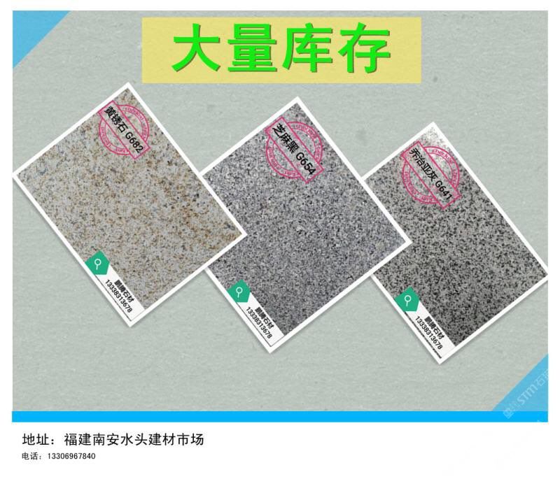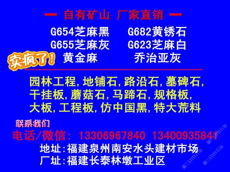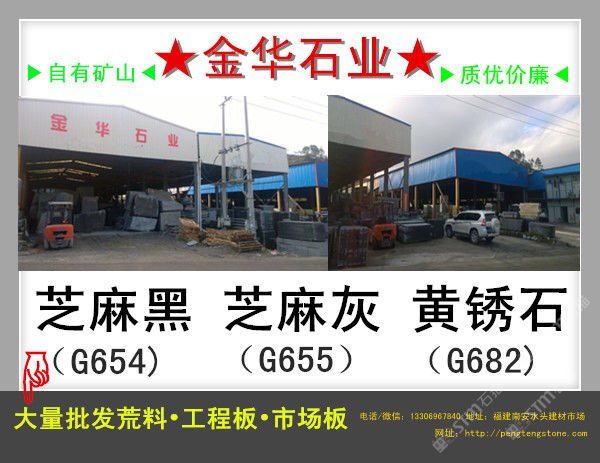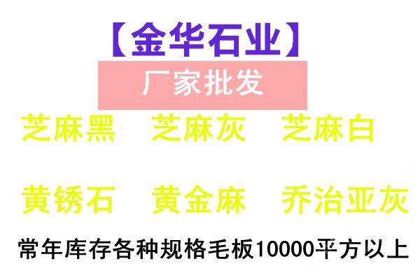 【金華石業(yè)】專(zhuān)門(mén)立足于本地豐富的自然資源,擁有成套先進(jìn)的石材設(shè)備,專(zhuān)業(yè)石材加工技術(shù)人員,掌握先進(jìn)的石材加工技術(shù),制定了一整套嚴(yán)格的質(zhì)量控制體系,品質(zhì)管理嚴(yán)格,專(zhuān)業(yè)生產(chǎn)本地石材:G654(芝麻黑),G655(芝麻灰),G682(黃銹石),G603(芝麻白),喬治亞灰,蝦紅、虎皮黃、毛光板,火燒板,踏步板,盲道板,機(jī)刨板,荔枝面,路沿石,蘑菇石,花壇石,花崗巖自然面,建筑用塊石,大型門(mén)牌石,墓碑石和橋柱橋欄,圓柱,等各種板材和弧形異型加工。