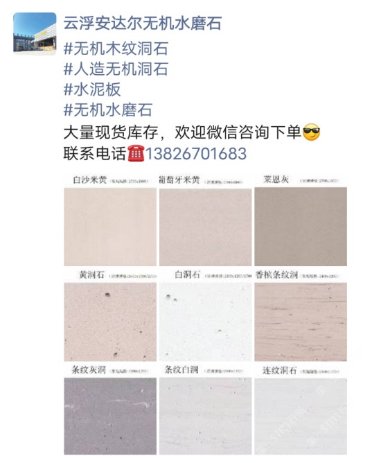 發(fā)布信息: #無(wú)機(jī)木紋洞石 #人造無(wú)機(jī)洞石 #水泥板 #無(wú)機(jī)水磨石 大量現(xiàn)貨庫(kù)存,歡迎微信咨詢(xún)下單[得意] 聯(lián)系電話(huà)??13826701683