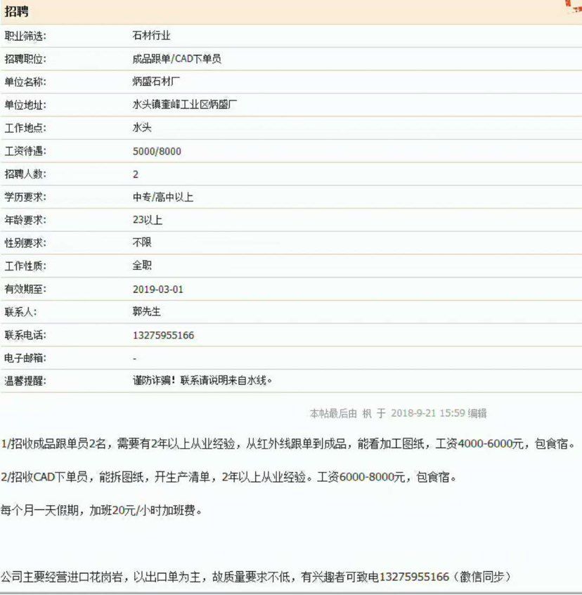 發(fā)布信息: 1/招收成品跟單員2名,需要有2年以上從業(yè)經(jīng)驗(yàn),從紅外線跟單到成品,能看加工圖紙,工資4000-6000元,包食宿。 2/招收CAD下單員,能拆CAD圖紙,開(kāi)生產(chǎn)清單,2年以上從業(yè)經(jīng)驗(yàn)。工資6000-8000元,包食宿。 每個(gè)月假期,工作8.5小時(shí),加班20元/小時(shí)加班費(fèi)。 公司主要經(jīng)營(yíng)進(jìn)口花崗巖,以出口單為主,故質(zhì)量要求不低,有興趣者可致電13275955166(徽信同步)