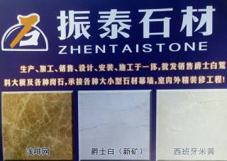 北京振泰石材主營(yíng)產(chǎn)品:爵士白,西班牙米黃,新雅士白,新西米,奧特曼(人造石),白雪晶(人造石),珊瑚海,珊瑚海1,貴族米黃,香妃玉蘭,香妃米黃2,拉菲紅,皇家白玉,紅龍玉8,山水畫1,皇家閃電,藍(lán)木紋5,云多拉灰12,云多拉灰13企業(yè)地址:河北廊坊香河石材城A0801、A0803